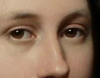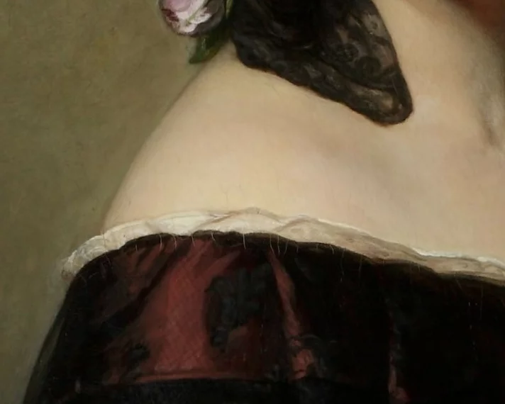 Le style idéalisé du peintre convient parfaitement à l’art du portrait mondain, notamment dans le traitement lisse des chairs, adoucies par la lumière. Une maîtrise subtile des effets de lumière et d’ombre permet de mieux souligner l’ovale du visage, tandis qu’un précis rayon de lumière vient rebondir sur l’épaule droite de la jeune femme, pour se prolonger jusqu’au décolleté, apportant une légère coloration érotique au portrait. Le fond neutre présente pourtant deux ombres portées, celle du modèle et pourquoi pas, celle du peintre.